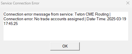 The issue you are having is that you are not able to connect to your trading account. The first thing to check is that you have the correct "Clearing Firm" set in your "Global Settings >> Data/Trade Service Settings >> Main Settings". If the above is correct, then you would need to check with your broker on why you are getting that message. -- In the meantime, if you want to get data without connecting to your trading account - set your "Global Settings >> Data/Trade Service Settings >> Main Settings >> Current Selected Service" to "SC Data". After making this change and selecting "OK" to close that window, you will be prompted to update the symbols. You need to answer "Yes" to this question. If you forget, or if you open a separate Chartbook later and need to update symbols, select "Edit >> Translate Symbols to Current Service". Just make sure to change your "Current Selected Service" back to "Teton CME Order Routing" when you have that working again. For the most reliable, advanced, and zero cost futures order routing, use the Teton service: Sierra Chart Teton Futures Order Routing |