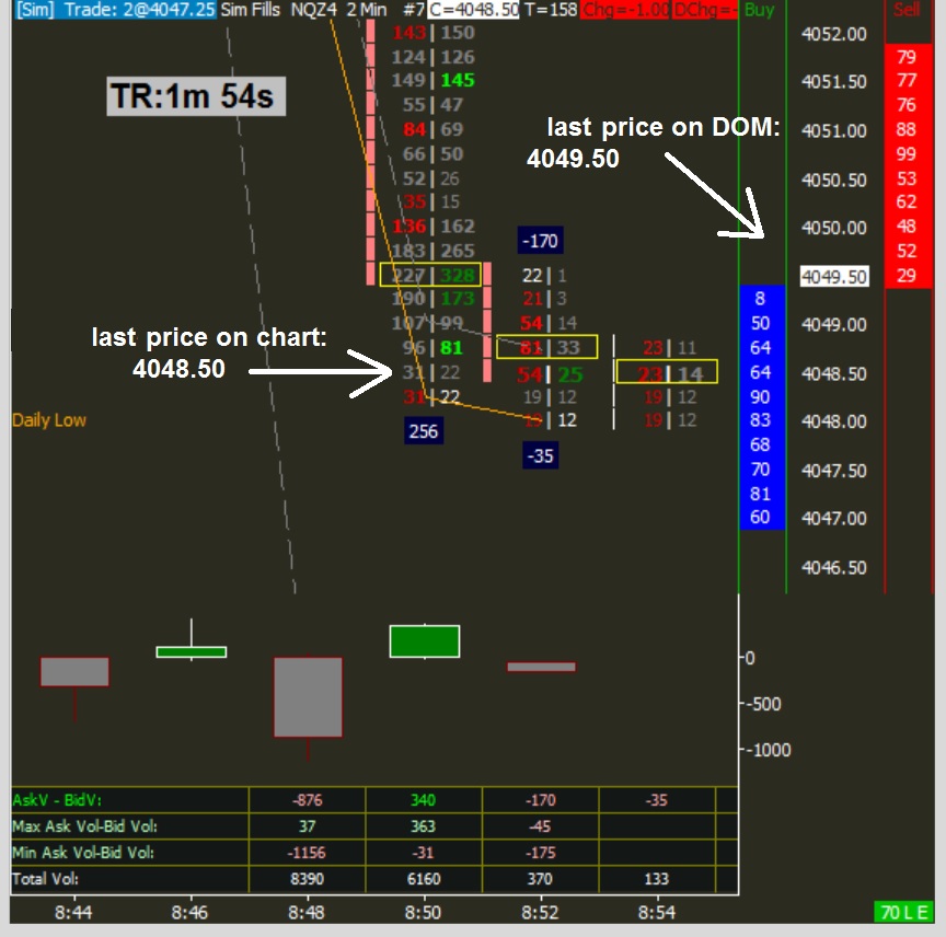 Hello, I have a problem that continuously shows up for about 2 weeks. This is the approximate time when I temporarily stopped using the Sierra Chart datafeed. Now I am using data from my broker OEC. Usually after session open my charts starts getting crazy. Last price for the same product on minute charts is different than DOM price etc. Its impossible to trade until the markets calm down (but even then I have not much trust in my charts or orderflow). This always comes up with higher volatility. I am enclosing screenshot with my today's mini Nasdaq chart where Last price on 2 minute chart is 4048.50 but DOM is 4049.50. Do you think that this problem may be caused by using bad datafeed, platform or by weak PC performance (which in my case is possible). Many thanks, Tomas |