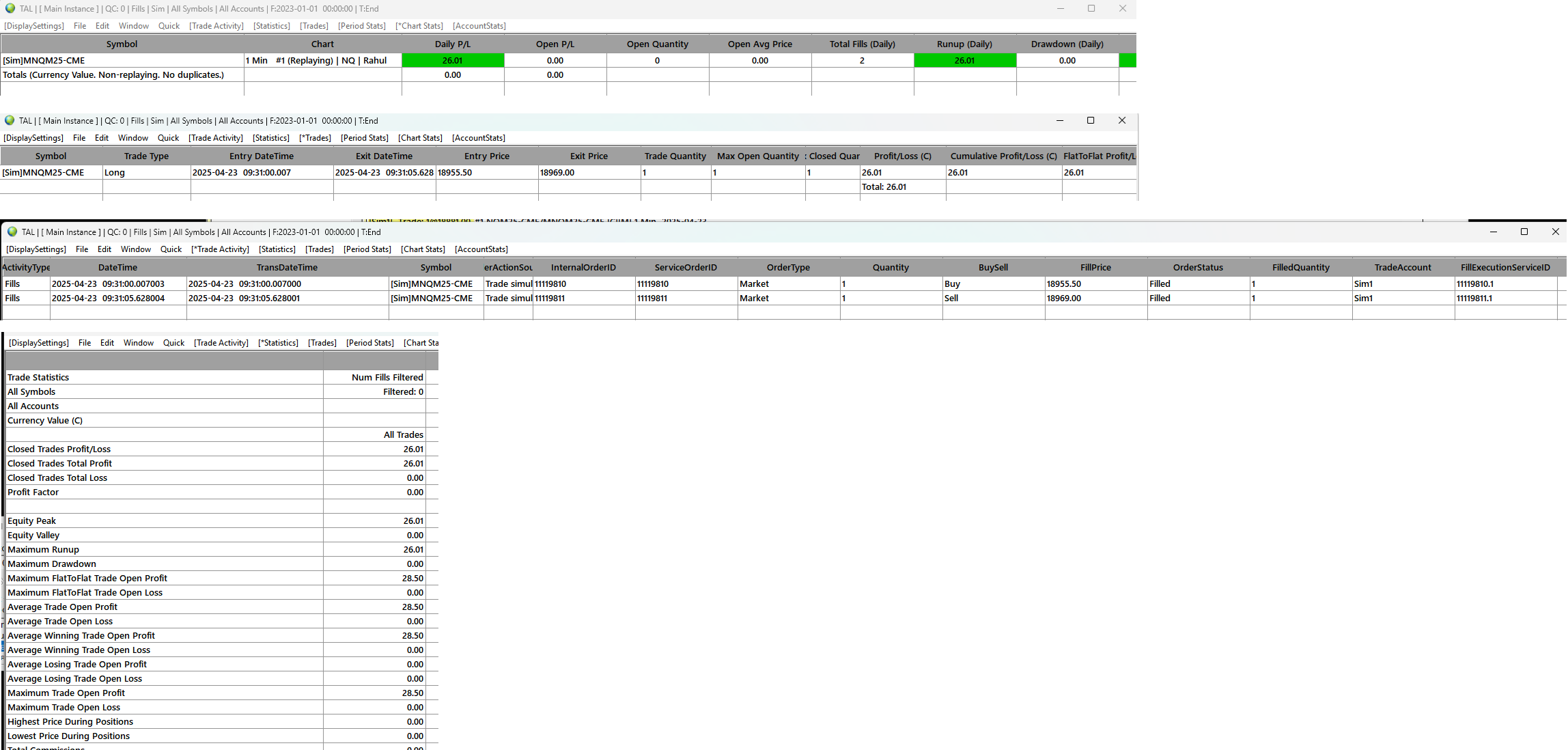 I have attached all relevant pages of the Trade Activity Log. I ran the replay on Sim1 Account, using only 1 Symbol. Once you stop the replay, the sc.GetTotalNetProfitLossForAllSymbols() value populates..... it doesn't populate during the chart replay. |