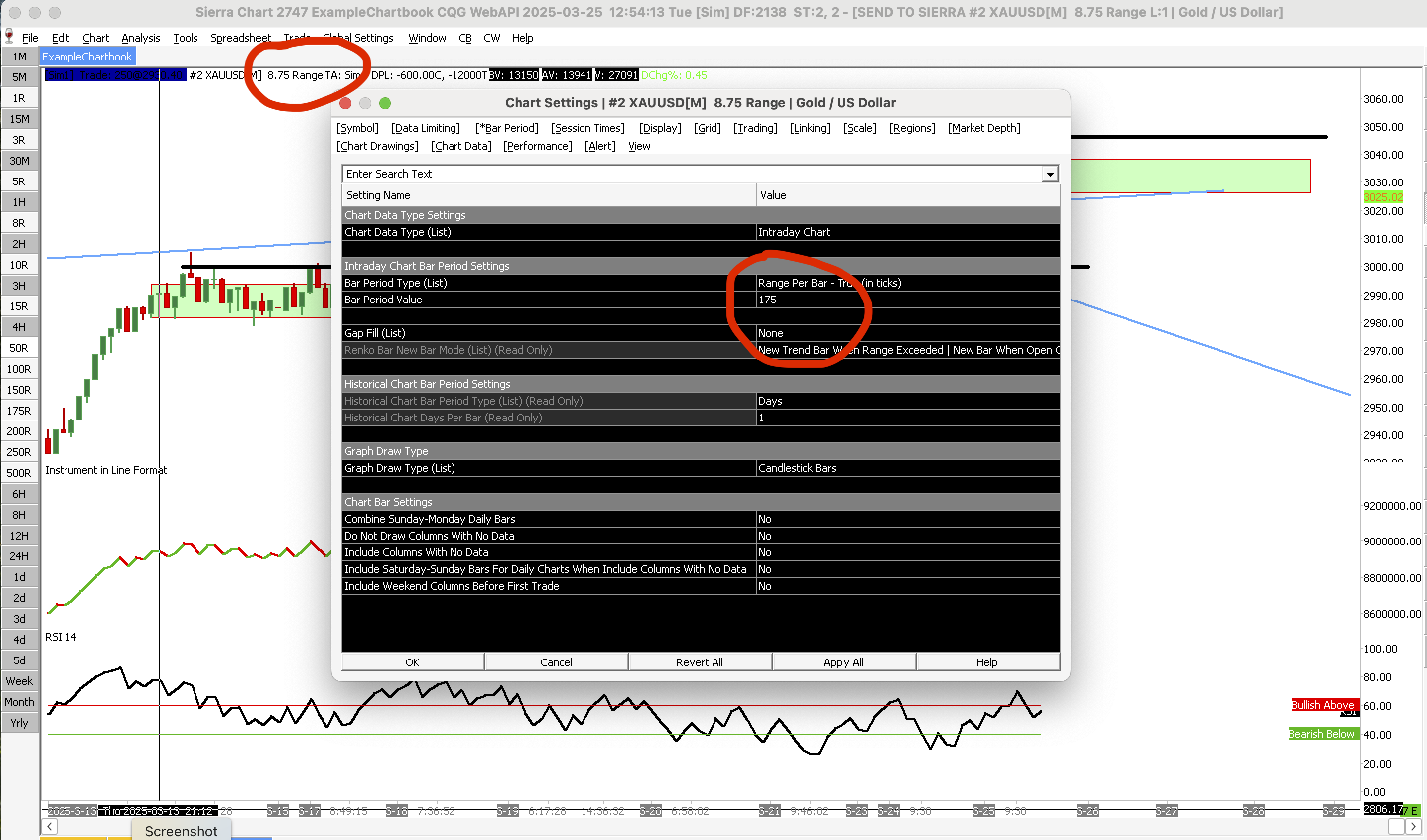 alright lads, please take a look at the screenshot. i've selected 175 ticks using the true range per bar format. can i ask why it's showing 8.75 range on the chart. surely it should be showing what i've selected in ticks? it's a bit confusing, after a while, i can't remember the setting i chose and it doesn't help the number shown on the chart is different. surely the figure and type should represent what i've chosen. please advise ta