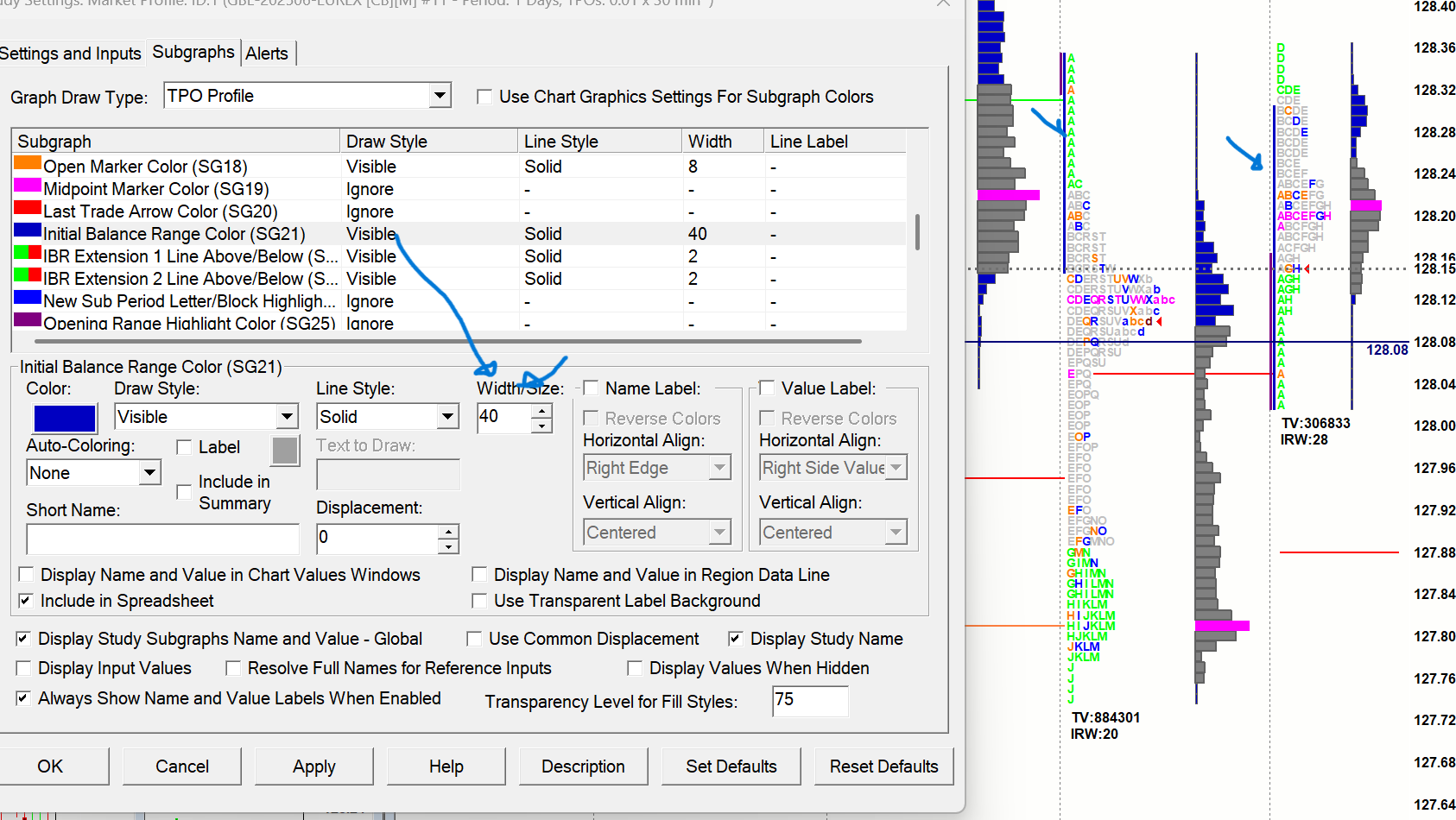 I would like to do a simple think. Increase the width of the IB lien (dargk blue) I have tried as usual by going into setting inital balance range color increase width / size, but it does not work. Can you pls point me in the right direction? Thanks |