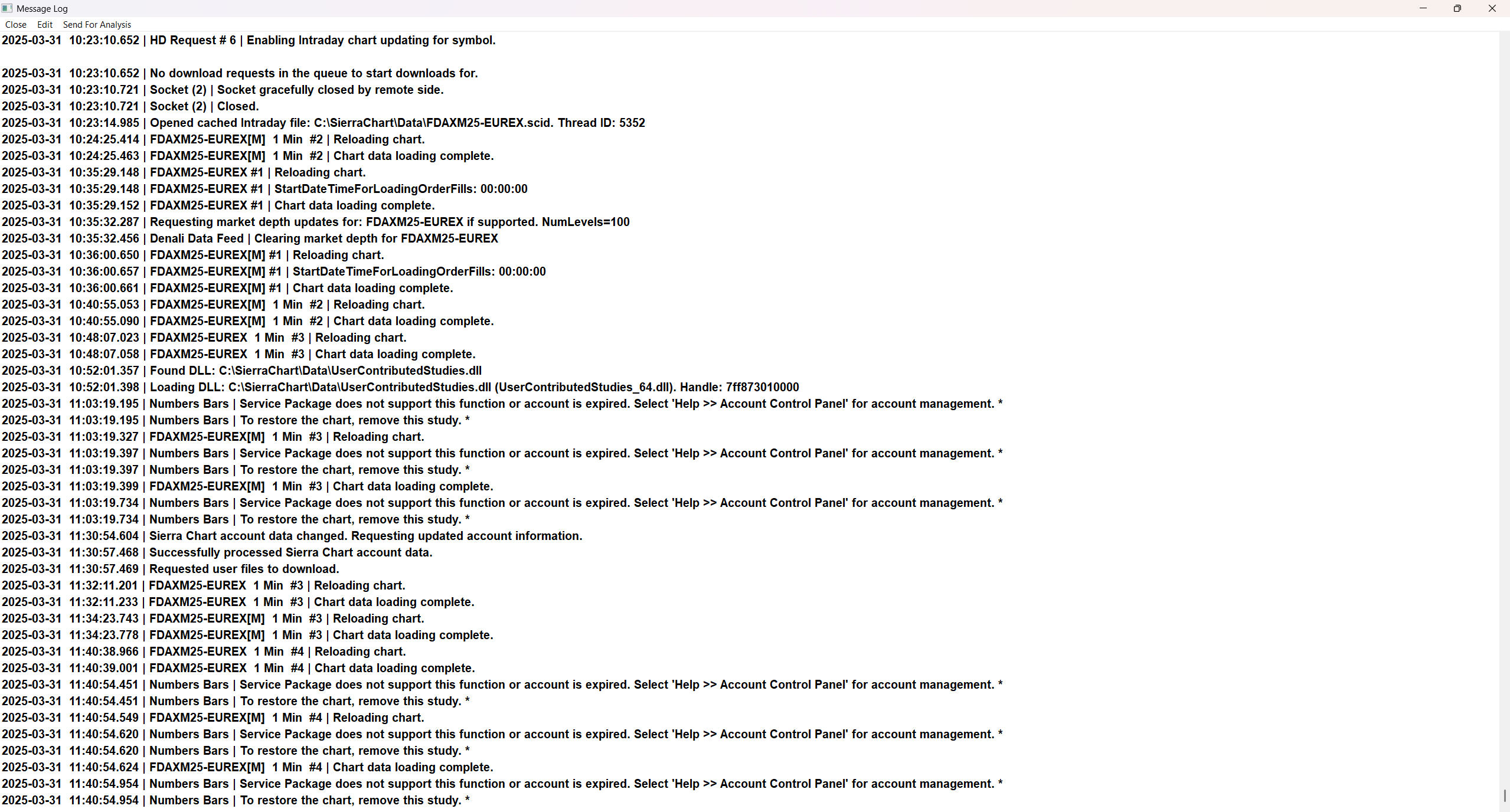 Hi Sierra Chart Support, I’ve activated the EUREX EOBI exchange and I’m currently on Service Package 10 (SP10). My Denali exchange cost is $25/month and my usage time is active until April 30, 2025. However, I’m still unable to use Numbers Bars — the study throws this message in the log: "Service Package does not support this function or account is expired." I’ve confirmed: SP10 is active EUREX is active Live data is flowing But my Services Balance is only $0.50 Do I need to top up my balance immediately, even though I already paid for this month? Please confirm what’s blocking Number Bars from working so I can fix it. Thanks! Muhannad Date Time Of Last Edit: 2025-03-31 13:25:49