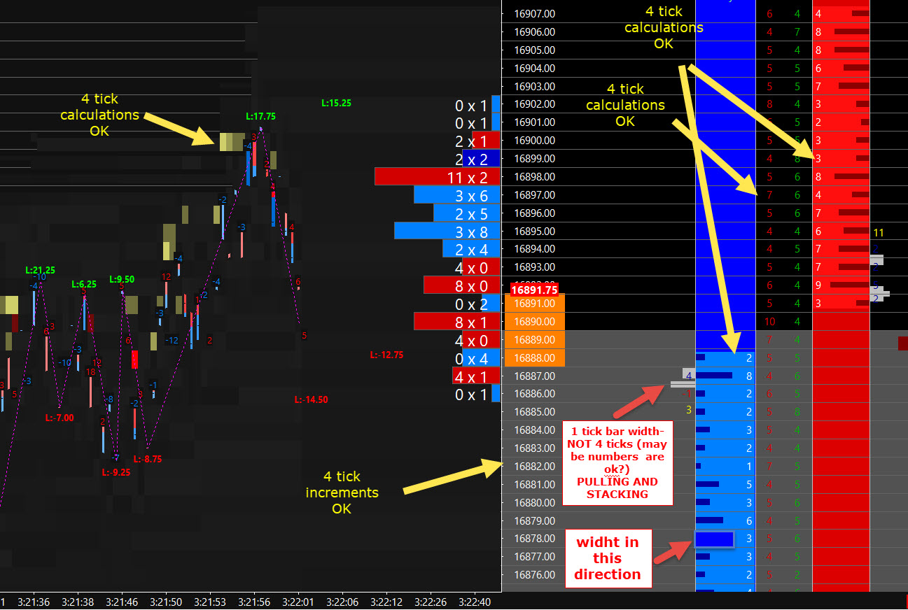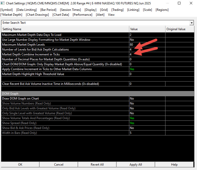 We do see the issue of the Pulling/Stacking Volume Bars showing all the levels and not the combined levels. We will look into this. With regards to the "Width" of the bars, meaning the height, there is not a way to change that. There is no reason to set the "Number of Levels for Bid/Ask Depth Calculations" to 4. If you are actually displaying values that use the Bid/Ask Depth Calculation data (such as Bid/Ask Depth Bars) then you will only see 4 levels worth of data (1 point). That setting is completely unrelated to combining the Market Depth/Volume data in the DOM for easier viewing. Refer to the following for what this setting does: Chart Settings: Number of Levels for Bid/Ask Depth Calculations (Chart >> Chart Settings >> Market Depth menu) For the most reliable, advanced, and zero cost futures order routing, use the Teton service: Sierra Chart Teton Futures Order Routing |
