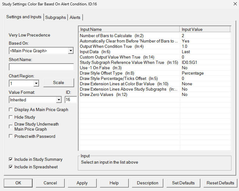 "We have allowed the Color Bar Based on Alert Condition study to set the width of the background drawing. So it does not occupy the full width of the chart column. It is now adjustable. You need to set it though to a width greater than 1 to change it to a smaller width." Forgive me. I can not find where to implement this? PS I am on build 2751 |