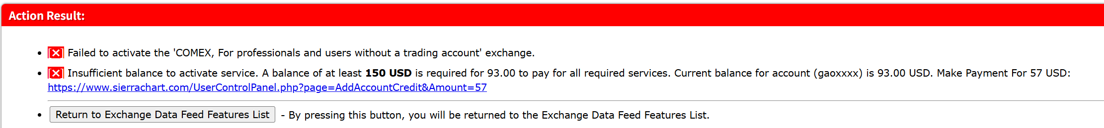 You need to activate the exchange that you need here: https://www.sierrachart.com/UserControlPanel.php?page=DenaliDataFeed Sierra Chart Support - Engineering Level Your definitive source for support. Other responses are from users. Try to keep your questions brief and to the point. Be aware of support policy: https://www.sierrachart.com/index.php?l=PostingInformation.php#GeneralInformation For the most reliable, advanced, and zero cost futures order routing, use the Teton service: Sierra Chart Teton Futures Order Routing |