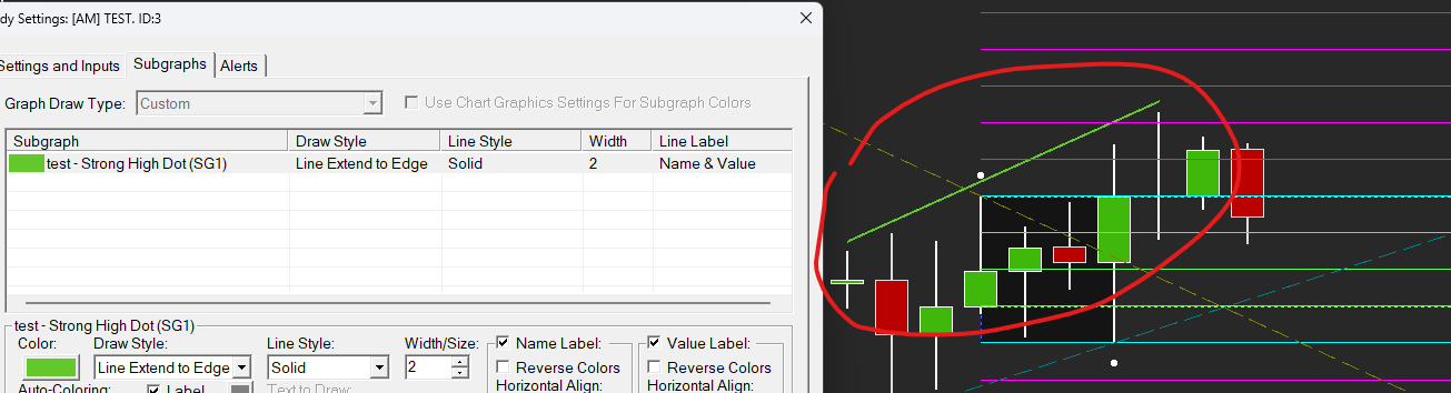 Hello, I am trying a simple graph SCSubgraphRef StrongLines = sc.Subgraph[0]; StrongLines.Name = "Test"; StrongLines.PrimaryColor = RGB(100,200,300); StrongLines.LineWidth = 2; StrongLines.DrawStyle = DRAWSTYLE_LINE_EXTEND_TO_EDGE; int idx1 = sc.ArraySize - 10; int idx2 = sc.ArraySize - 3; StrongLines[idx1] = sc.High[idx1]; StrongLines[idx2] = sc.High[idx2]; Just draw a line, not a ray as expected. Is it supported or I am doing something wrong? Date Time Of Last Edit: 2025-04-26 10:30:02