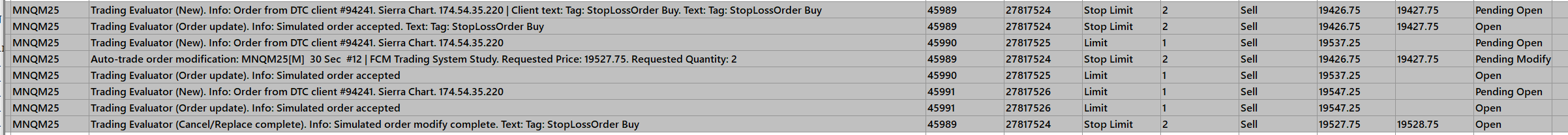 Hello, I'm having a problem with sc.ModifyOrder assigning the incorrect price for a stop limit order. This is occurring with the trade evaluation service. My code is shown below with the log output. A request was made to set price 1 to 19,426 and price 2 to 19,427. After sending the request I retrieved the order data using a GetOrderByOrderID call. Price 1 was set to 19,527. Price2 was set to 19,528. if (ModifyStopLossOrder == true) { double NewOrderQuantity = std.StopLossOrder->OrderData.OrderQuantity + FillEventQuantity; s_SCNewOrder ModifyOrder; ModifyOrder.InternalOrderID = std.StopLossOrder->InternalOrderID; ModifyOrder.OrderQuantity = NewOrderQuantity; if (EntryOrder.OrderData.BuySell == BSE_BUY) { ModifyOrder.Price1 = EntryOrderAveragePrice - (StopLossTicks * sc.TickSize); // stop loss price ModifyOrder.Price2 = StopLossPrice + (4 * sc.TickSize); // stop loss limit price if (debug) { Buffer.Format("PlaceAdjustStopLossOrder - Existing BSE_BUY StopLossOrder.InternalOrderID = %d, Price = %f, Limit Price = %lf, Quantity = %lf", std.StopLossOrder->InternalOrderID, ModifyOrder.Price1, ModifyOrder.Price2, NewOrderQuantity); sc.AddMessageToLog(Buffer, 1); } } else { ModifyOrder.Price1 = EntryOrderAveragePrice + (StopLossTicks * sc.TickSize); // stop loss price ModifyOrder.Price2 = StopLossPrice - (4 * sc.TickSize); // stop loss limit price if (debug) { Buffer.Format("PlaceAdjustStopLossOrder - Existing BSE_SELL StopLossOrder.InternalOrderID = %d, Price = %f, Limit Price = %lf, Quantity = %lf", std.StopLossOrder->InternalOrderID, ModifyOrder.Price1, ModifyOrder.Price2, NewOrderQuantity); sc.AddMessageToLog(Buffer, 1); } } int Result = sc.ModifyOrder(ModifyOrder); if (Result > 0) { if (debug) { Buffer.Format("PlaceAdjustStopLossOrder - sc.ModifyOrder Result > 0, Result = %d, InternalOrderID = %d, ModifyOrder.Price 1 = %lf, ModifyOrder.Price2 = %lf", Result, ModifyOrder.InternalOrderID, ModifyOrder.Price1, ModifyOrder.Price2); sc.AddMessageToLog(Buffer, 1); } std.StopLossOrder->OrderQuantity = NewOrderQuantity; std.StopLossOrder->Price = ModifyOrder.Price1; // test to read current order status s_SCTradeOrder TestOrder; int TestResult = sc.GetOrderByOrderID(ModifyOrder.InternalOrderID, TestOrder); Buffer.Format("PlaceAdjustStopLossOrder - Post Modify Stop Loss Order Callback - InternalOrderID = %d, Price = %lf, Limit Price = %lf", ModifyOrder.InternalOrderID, TestOrder.Price1, TestOrder.Price2); sc.AddMessageToLog(Buffer, 1); } else { Buffer.Format("PlaceAdjustStopLossOrder - Failed to modify existing stop loss order InternalOrderID = %d", std.StopLossOrder->InternalOrderID); sc.AddMessageToLog(Buffer, 1); } } The log output from the AddMessageToLog calls above is shown below. 2025-04-30 01:11:55.280 | Chart: MNQM25[M] 30 Sec #12 | Study: FCM Trading System Study | PlaceAdjustStopLossOrder - Existing BSE_BUY StopLossOrder.InternalOrderID = 45989, Price = 19426.083333, Limit Price = 19427.083333, Quantity = 6.000000 * 2025-04-30 01:11:55.281 | Chart: MNQM25[M] 30 Sec #12 | Study: FCM Trading System Study | PlaceAdjustStopLossOrder - sc.ModifyOrder Result > 0, Result = 1, InternalOrderID = 45989, ModifyOrder.Price 1 = 19426.083333, ModifyOrder.Price2 = 19427.083333 * 2025-04-30 01:11:55.281 | Chart: MNQM25[M] 30 Sec #12 | Study: FCM Trading System Study | PlaceAdjustStopLossOrder - Post Modify Stop Loss Order Callback - InternalOrderID = 45989, Price = 19527.750000, Limit Price = 19528.750000 * The trade activity log out related to order 45989 is shown below. I also attached a screen shot of the activity log to make it easier to view. ActivityType DateTime TransDateTime Symbol OrderActionSource InternalOrderID ServiceOrderID OrderType Quantity BuySell Price Price2 OrderStatus FillPrice FilledQuantity TradeAccount OpenClose ParentInternalOrderID PositionQuantity FillExecutionServiceID HighDuringPosition LowDuringPosition Note AccountBalance ExchangeOrderID ClientOrderID TimeInForce Username IsAutomated Orders 2025-04-30 01:11:26.060051 2025-04-30 01:11:26.060032 MNQM25 Trading Evaluator (New). Info: Order from DTC client #94241. Sierra Chart. 174.54.35.220 | Client text: Tag: StopLossOrder Buy. Text: Tag: StopLossOrder Buy 45989 27817524 Stop Limit 2 Sell 19426.75 19427.75 Pending Open fcm_ldt Close 2 StopLossOrder Buy 0.00 45989.89569 Good till Canceled Richard Novak Y Orders 2025-04-30 01:11:26.060093 2025-04-30 01:11:26.060091 MNQM25 Trading Evaluator (Order update). Info: Simulated order accepted. Text: Tag: StopLossOrder Buy 45989 27817524 Stop Limit 2 Sell 19426.75 19427.75 Open fcm_ldt Close 2 StopLossOrder Buy 0.00 27817524 45989.89569 Good till Canceled Richard Novak Y Orders 2025-04-30 01:11:26.060103 2025-04-30 01:11:26.060102 MNQM25 Trading Evaluator (New). Info: Order from DTC client #94241. Sierra Chart. 174.54.35.220 45990 27817525 Limit 1 Sell 19537.25 Pending Open fcm_ldt Close 2 0.00 45990.97473 Good till Canceled Richard Novak Y Orders 2025-04-30 01:11:26.213169 2025-04-30 01:11:26.213166 MNQM25 Auto-trade order modification: MNQM25[M] 30 Sec #12 | FCM Trading System Study. Requested Price: 19527.75. Requested Quantity: 2 45989 27817524 Stop Limit 2 Sell 19426.75 19427.75 Pending Modify fcm_ldt Close 2 StopLossOrder Buy 0.00 27817524 45989.89569 Good till Canceled Richard Novak Y Orders 2025-04-30 01:11:26.275828 2025-04-30 01:11:26.275822 MNQM25 Trading Evaluator (Order update). Info: Simulated order accepted 45990 27817525 Limit 1 Sell 19537.25 Open fcm_ldt Close 2 0.00 27817525 45990.97473 Good till Canceled Richard Novak Y Orders 2025-04-30 01:11:26.275888 2025-04-30 01:11:26.275886 MNQM25 Trading Evaluator (New). Info: Order from DTC client #94241. Sierra Chart. 174.54.35.220 45991 27817526 Limit 1 Sell 19547.25 Pending Open fcm_ldt Close 2 0.00 45991.51616 Good till Canceled Richard Novak Y Orders 2025-04-30 01:11:26.275920 2025-04-30 01:11:26.275919 MNQM25 Trading Evaluator (Order update). Info: Simulated order accepted 45991 27817526 Limit 1 Sell 19547.25 Open fcm_ldt 
