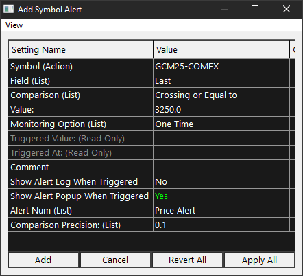 I use Add Symbol Alert all the time for quick access to setting price alerts. Is there a way to provide Studies in the chart as a signal or input? Looking for a rapid way to set alerts based on Price and Studies in the Chart as day progresses Example: At X point in the future when Price Crosses or Equal to VWAP (Or Any Study price) I want an alert. Of course I use Study Settings: Alerts but those are persistent and fire every time, different use case. |