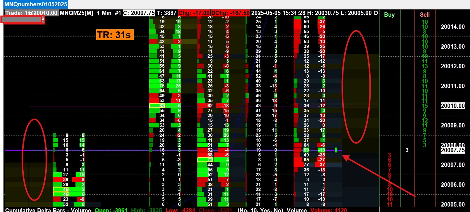 Maybe I'm missing something, but I've checked and rechecked several times: I'm not getting the Bid vol x Ask vol function data in the Numbers Bars study. The volume column appears, as does the Bid Ask difference, but I'm not getting the split data (you can see the cursor moving between the levels in a ghostly way). I changed all the settings, opened new charts, updated the software version but there was nothing to do. Also, a general coloring appeared on the last bars, a sort of halo, which I don't understand. I'm attaching a screenshot. Thanx in advance for you reply.