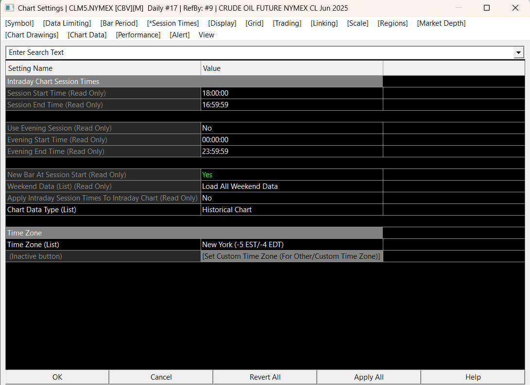 Hi, I have this issue with all my daily charts for the past week. Each morning when it updates with a new bar it is plotting the low of the prior day as the low of the session so far, rather than the true low of the session. Attached is a chart showing CL (June contract). The low of the session as of 10am EST is 58.67, however my daily chart is showing the low to be 57.03. Tomorrow when my charts update, it will correct this days bar, but then the current days bar will be incorrect. Also, I have attached my settings. I have had this chart for a very long time, I'm not sure why it is all the sudden doing this (it possible I changed a setting but I'm not sure what it could have been). I am also having the same issue with my ES and NQ daily charts. Thanks |