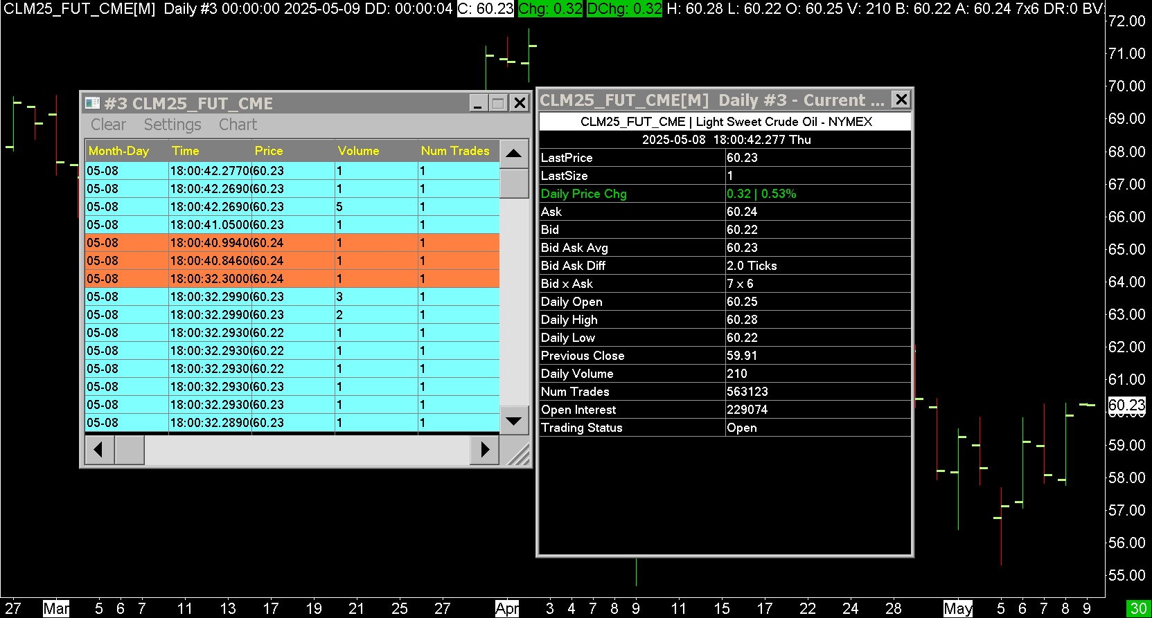 We would not expect other users to have a problem. We tested this, and all of the steps to properly start a new bar for the day worked properly: https://www.sierrachart.com/image.php?Image=1746741648418.png What is this setting set to: Global Settings >> Data/Trade Service Settings >> Common Settings >> Historical Daily Data Download Time Go into the Global Settings >> Symbol Settings. For the CL futures symbol, we need to know if these are set differently than defaults: Start New Daily Bar at Start Time New Daily Bar Start Time Sierra Chart Support - Engineering Level Your definitive source for support. Other responses are from users. Try to keep your questions brief and to the point. Be aware of support policy: https://www.sierrachart.com/index.php?l=PostingInformation.php#GeneralInformation For the most reliable, advanced, and zero cost futures order routing, use the Teton service: Sierra Chart Teton Futures Order Routing Date Time Of Last Edit: 2025-05-10 15:22:47