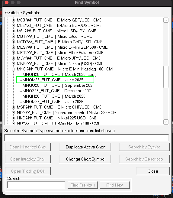 That is not the correct symbol for NASDAQ futures when using SC Data-All Services. You will find the correct symbol in File >> Find Symbol >> Futures-CME. What futures trading/brokerage service do you use? For the reason why we ask this question, refer to: Real-Time Exchange Data Feeds Available From Sierra Chart: Understanding and Accessing Data From the CME, CBOT, NYMEX, COMEX Exchanges (Understanding and Accessing Data From the CME, CBOT, NYMEX, COMEX Exchanges) Sierra Chart Support - Engineering Level Your definitive source for support. Other responses are from users. Try to keep your questions brief and to the point. Be aware of support policy: https://www.sierrachart.com/index.php?l=PostingInformation.php#GeneralInformation For the most reliable, advanced, and zero cost futures order routing, use the Teton service: Sierra Chart Teton Futures Order Routing |