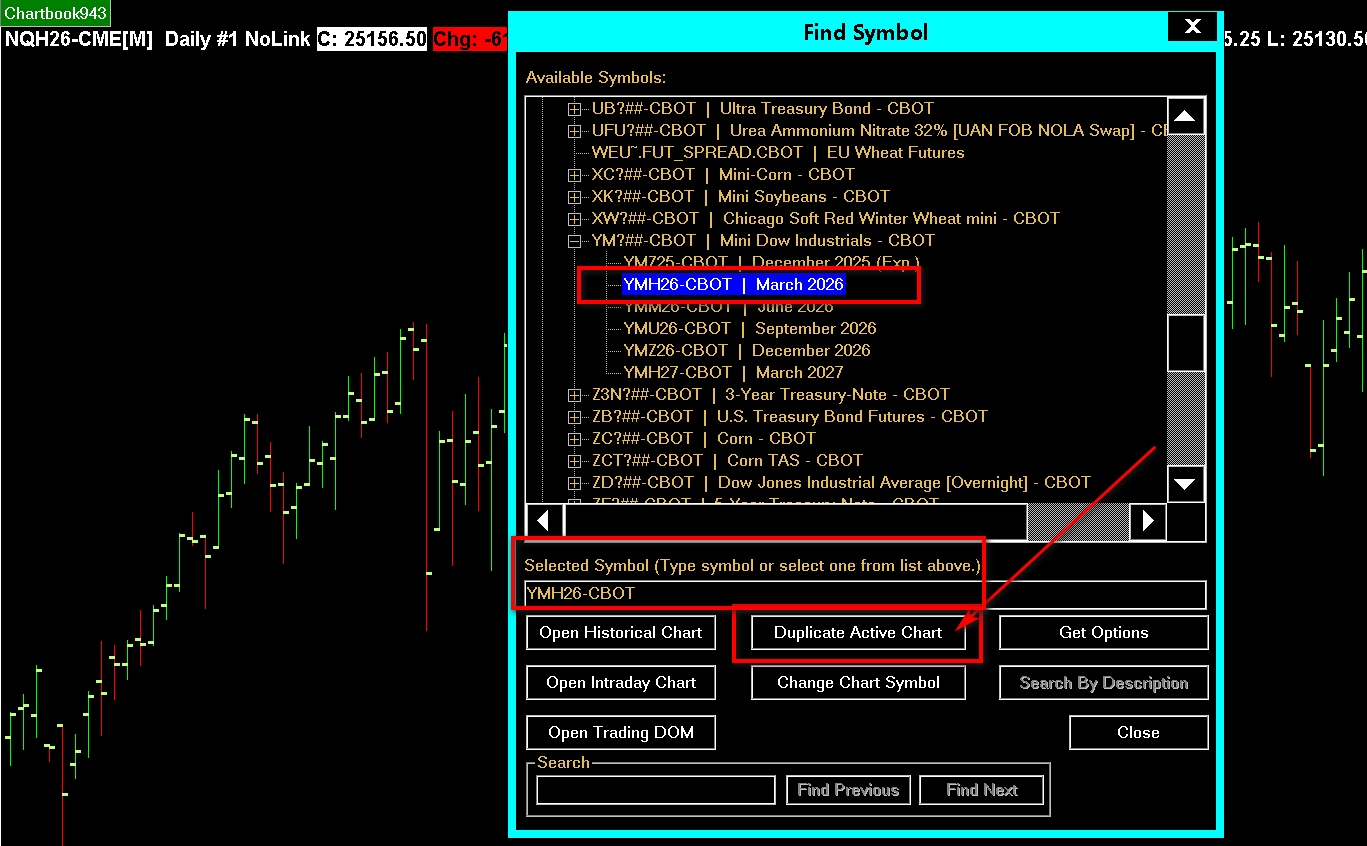 - An easier way to duplicate a chart or Trade DOM and have it be set to a particular symbol, is to go to that chart that you want to duplicate and then select File >> Find Symbol. Select the symbol in the list you want for the duplicated chart or Trade DOM and press the Duplicate Active Chart button.
