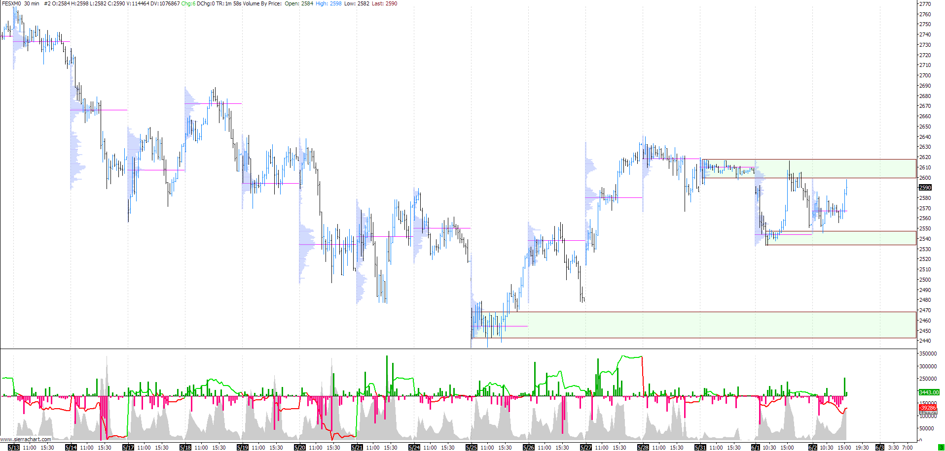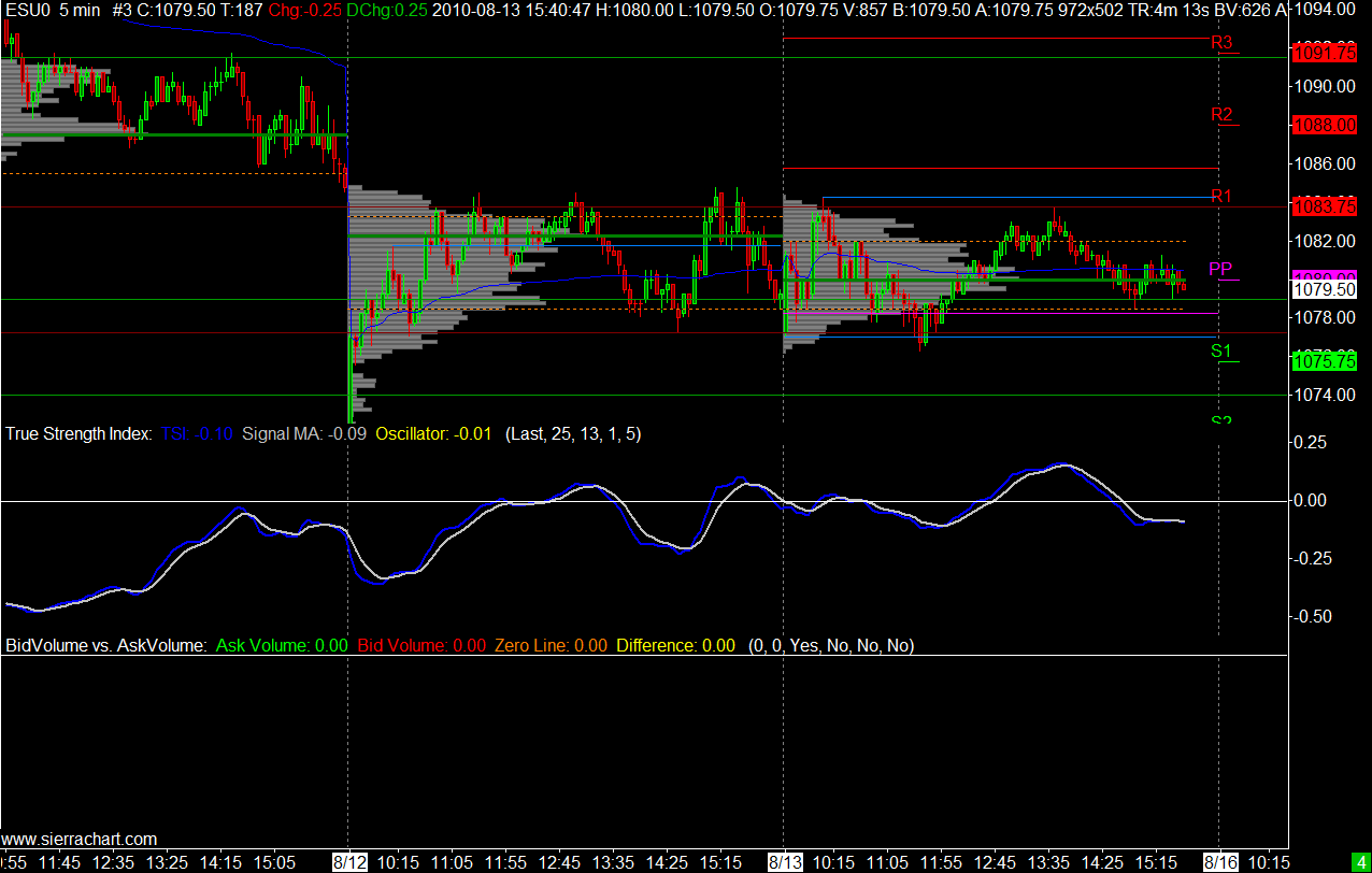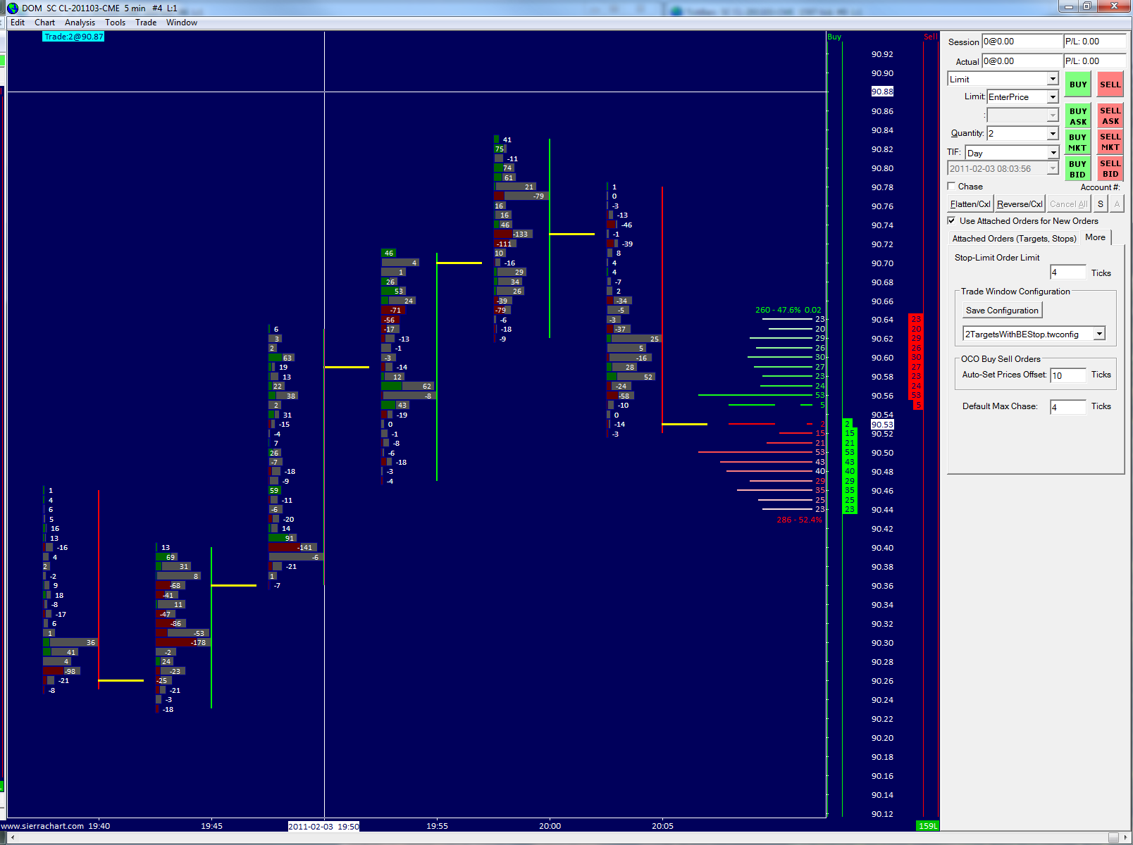 Image Uploaded on 2011-02-03 using SC version 674 by chrislb Note: Simple 5min bar chart with VbP set to 5min too. Volume Display set to Ask-Bid Volume (Delta) and bar width to 50% period length. |