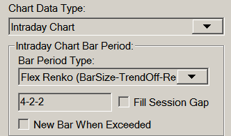To use these bars, select Chart >> Chart Settings on the menu. In the Intraday Bar Period >> Bar Period Type list, select Flex Renko Inverse Set Bar (in ticks). The parameters are described below.