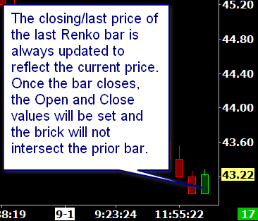 Sierra Chart Renko bars also update the last bar closing/last price as real-time data is received. The last bar in the chart could be either an Up or Down Renko Bar, and is not determined until the bar is complete. The final bar is never removed, but the Open value of the bar can change when the bar is closed. Refer to the image below.
