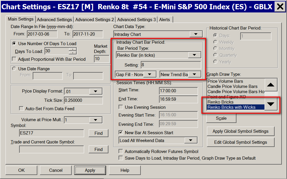 When the opening price of the new session for the day is outside of the range of the previous Renko bar, the range from the close of the prior bar to the open of the new bar (the gap) is filled with Renko bars if using the Gap Fill - Fill All Bar Gaps | Gap Fill - Fill Bar Gap at Start of Day setting. The Renko bars will have the same Date-Time as the new Renko bar. The effect of this can easily be seen when looking at a chart with Day Session only data. - Press OK to close the Chart Settings window.